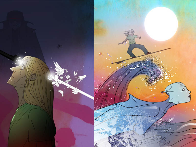 Quando Ginno, il proprietario del negozio, lo obbliga a nuovi turni massacranti, Cap ormai privo di ogni spiraglio di libertà, si rifugia annichilito sotto la doccia, stringendo a sé l’ultima tavola incompiuta. Mentre la disperazione lo divora, inaspettatamente, due presenze misteriose si manifestano e lo invitano a surfare tra le onde del suo mondo interiore.