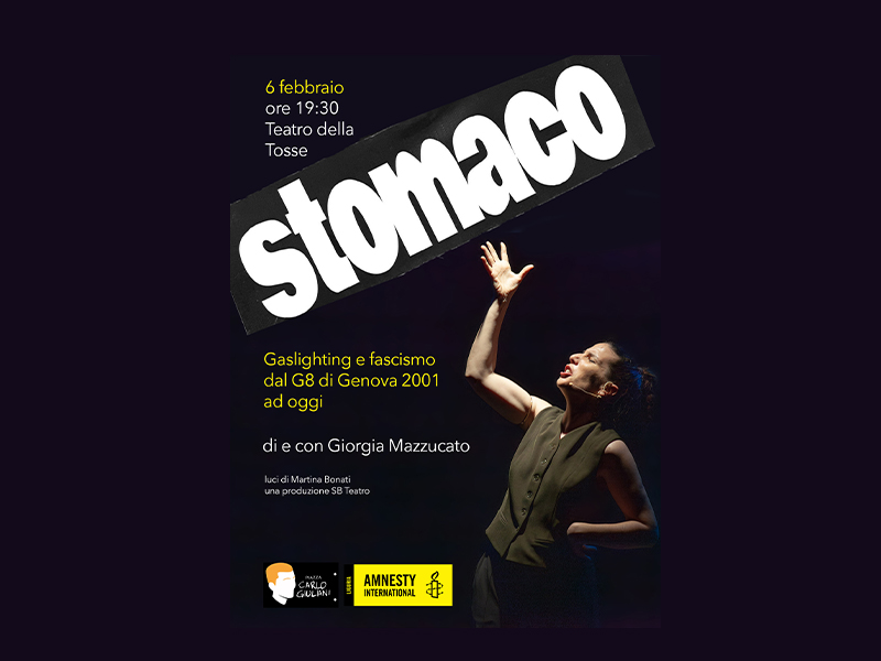 A quasi 25 anni dal trauma collettivo del G8 di Genova 2001, “Stomaco” ne racconta i fatti per restituirci una mappa storica e sociale nella quale tentare di orientarsi per interpretare questo presente. Gaslighting istituzionale, repressione politica del dissenso, piazze in lotta, questo spettacolo ci ricorda che quello che viviamo oggi ha radici passate e ora è nostra responsabilità prendere posizione, esporci per proteggere le nostre libertà.